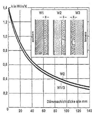 Je kleiner der k-Wert, umso besser die Wärmedämmung! Werte um 0,4 W/m²K werden als wirtschaftlich optimal angesehen. Die Wandkonstruktionen W1 und W" sind Innendämmungen, W3 ist eine Außendämmung mit hinterlüfteter Fassade.